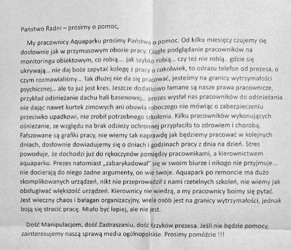 Do radnych Rady Miejskiej w Polkowicach (jaki i burmistrza), wpłynął wstrząsający list od pracowników polkowickiego parku wodnego. Autorzy pisma opisują rzeczywistość pełną inwigilacji, zastraszania i rażącego łamania zasad BHP. Z relacji zatrudnionych wyłania się obraz skrajnego napięcia. W tej sytuacji wzrok wszystkich kieruje się na Urząd Gminy. Gmina Polkowice jest bowiem 100% akcjonariuszem spółki. Brak zdecydowanej reakcji ze strony Burmistrza, Wiesława Wabika, budzi szczególne kontrowersje w kontekście jego wyborczych deklaracji. Przypomnijmy, że włodarz wielokrotnie podkreślał, iż to „Polkowiczanie są jego pracodawcą”. Obecna sytuacja w Aquaparku, gdzie mieszkańcy pracujący w gminnej spółce czują się zastraszani, stawia te słowa pod wielkim znakiem zapytania. Czy „pracodawca” (mieszkańcy) może liczyć na ochronę ze strony swojego pełnomocnika (burmistrza)?