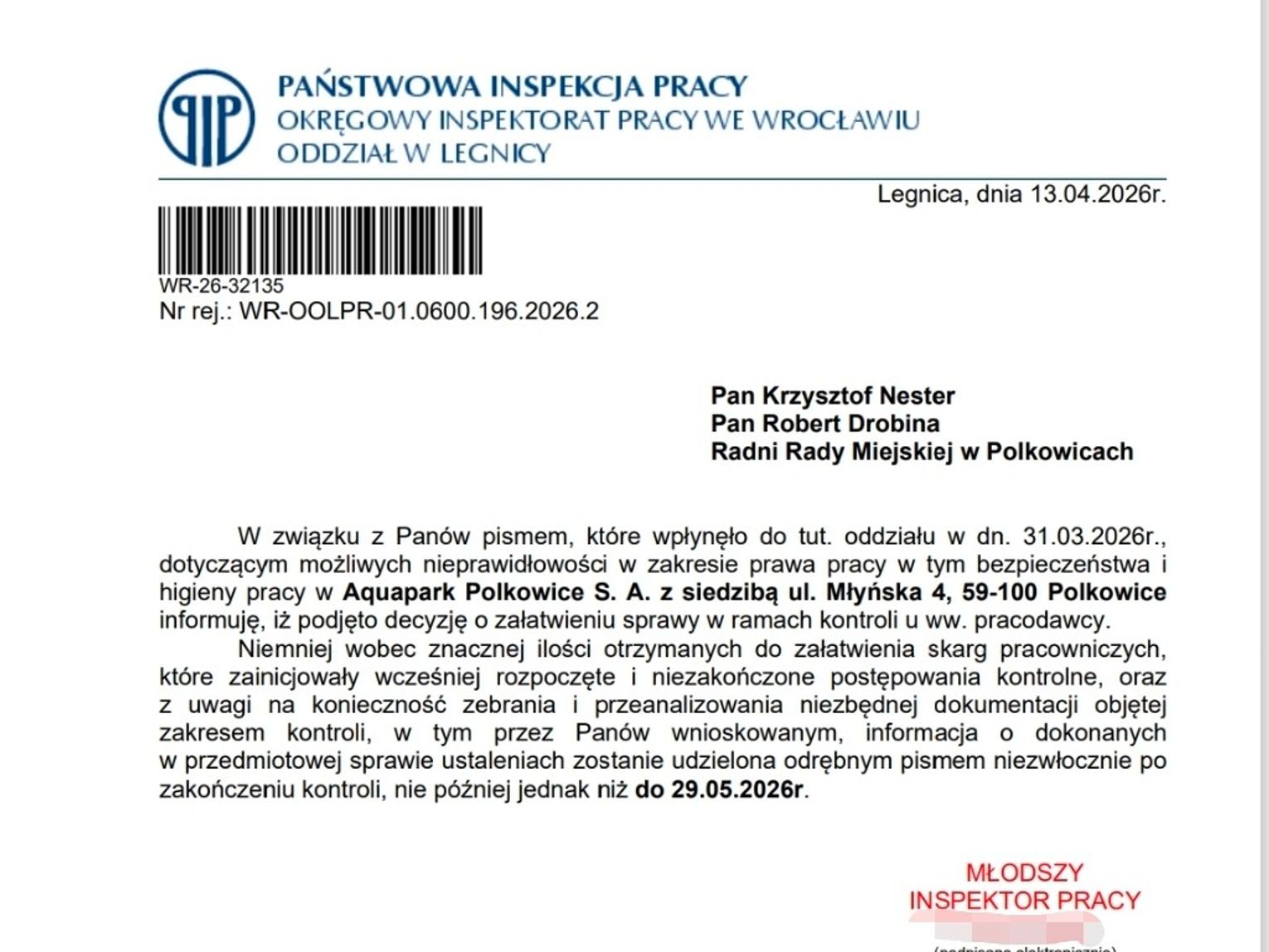 Sprawa nabrała tempa po piśmie skierowanym do PIP przez radnych Rady Miejskiej w Polkowicach, to jest: Krzysztofa Nestera oraz Roberta Drobinę. Samorządowcy domagali się wyjaśnienia sygnałów dotyczących możliwych nieprawidłowości w obszarze prawa pracy oraz bezpieczeństwa i higieny pracy (BHP) w miejskiej spółce. Z oficjalnej odpowiedzi, którą otrzymali radni, wyłania się niepokojący obraz. Państwowa Inspekcja Pracy przyznaje, że sygnały od radnych to nie jedyne zastrzeżenia, jakie wpłynęły do urzędu.