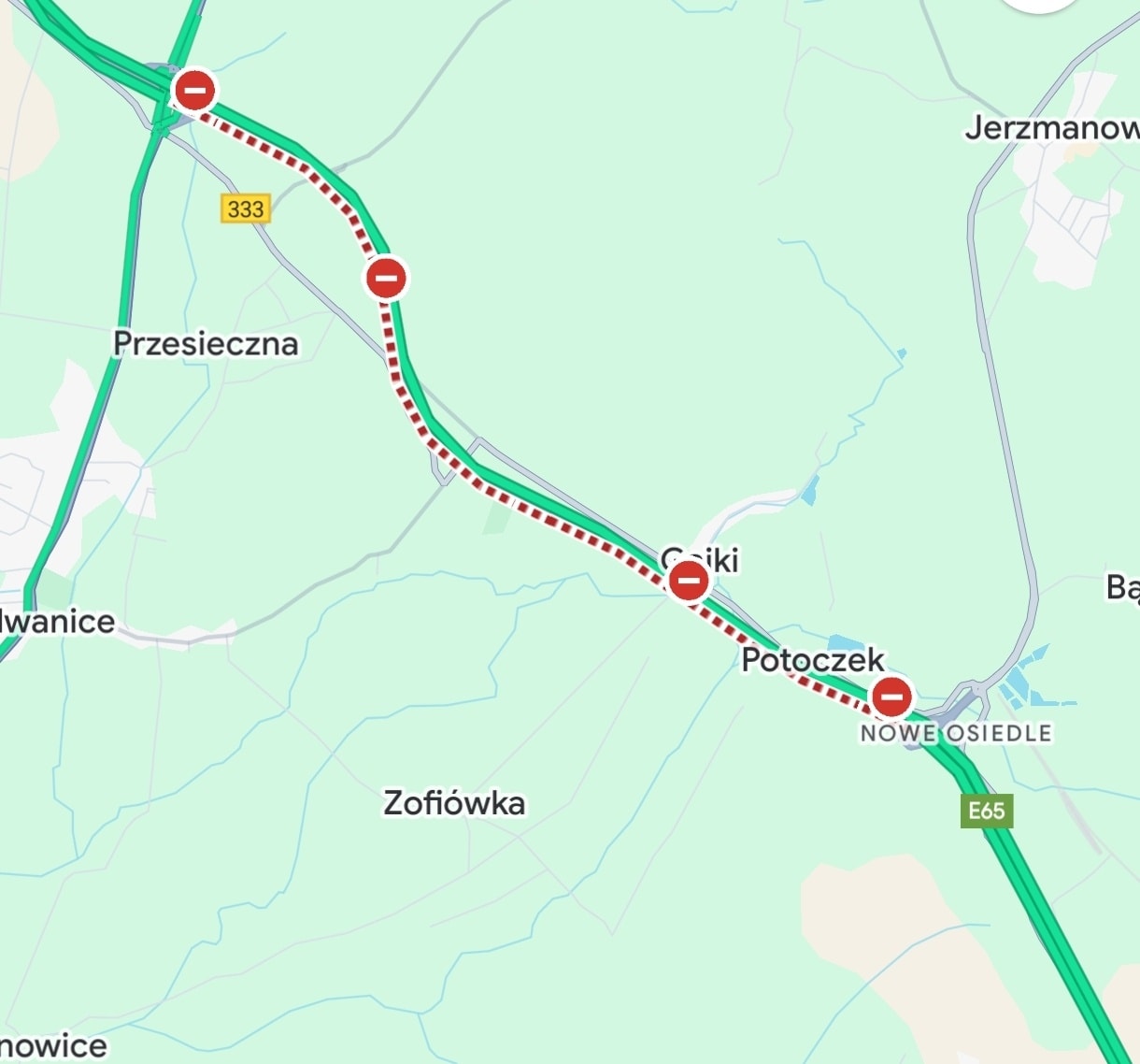 Dla osób jadących od strony Nowego Miasteczka w kierunku Polkowic, obowiązuje objazd starą trasą - droga nr 333.