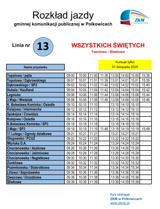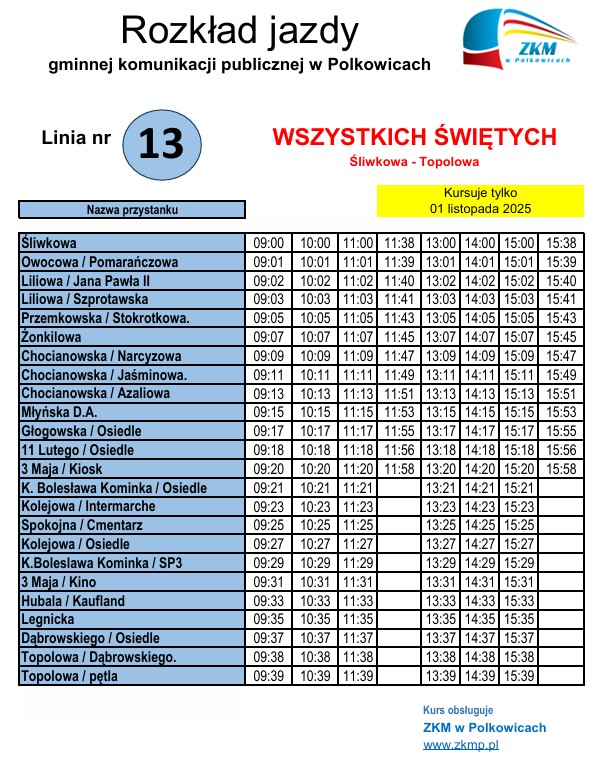 1 listopada Zakład Komunikacji Miejskiej w Polkowicach uruchomi specjalną linię autobusową nr 13, umożliwiającą mieszkańcom dotarcie do polkowickich nekropolii.