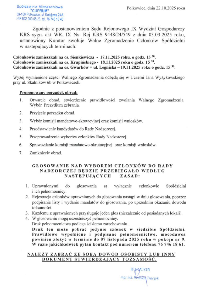 Kuratorem w SM Cuprum został wieloletni jej prezes, radny rady miejskiej, Ireneusz Traczyk. Ten zwołał Walne Zgromadzenie w trzech terminach, różnych dla poszczególnych osiedli. W trakcie obrad członkowie będą mieli możliwość głosowania nad wyborem członków Rady Nadzorczej – organu, który wybiera zarząd SM.