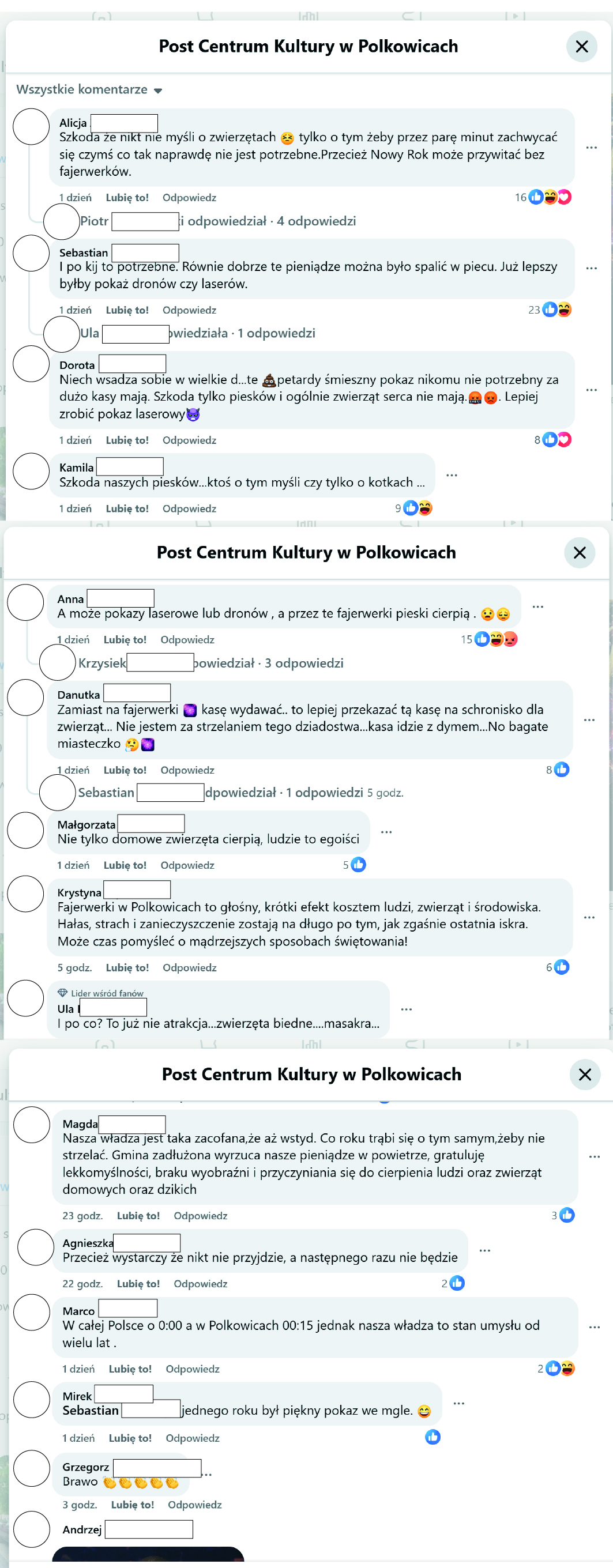 Nasza władza jest taka zacofana, że aż wstyd. Co roku trąbi się o tym samym, żeby nie strzelać. Gmina zadłużona wyrzuca nasze pieniądze w powietrze, gratuluję lekkomyślności, braku wyobraźni i przyczyniania się do cierpienia ludzi oraz zwierząt domowych oraz dzikich.