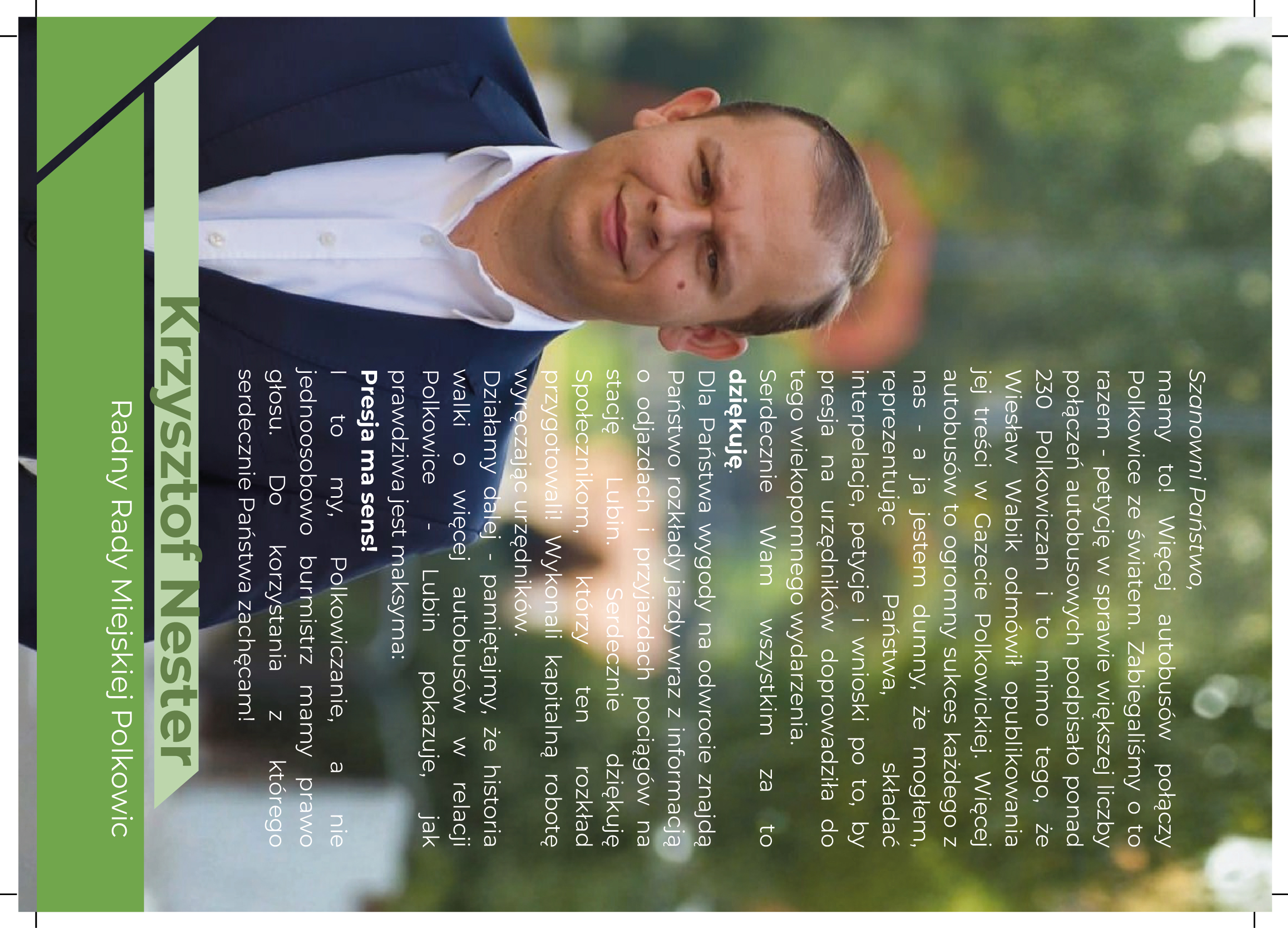 Krzysztof Nester: Mieszkańcy Polkowic mieli duże trudności z dotarciem do innych części Dolnego Śląska, a także do dalszych regionów kraju. Brak sprawnego dojazdu do dworca kolejowego w Lubinie powodował realne wykluczenie komunikacyjne.