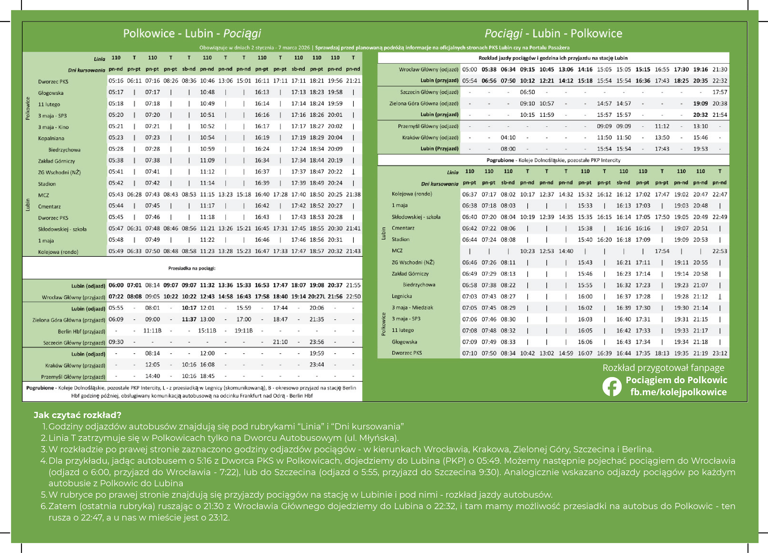 Wspólnie z wolontariuszami fanpage’a Pociągiem do Polkowic przygotowaliśmy przejrzysty rozkład jazdy. Obejmuje on całą drogę podróży: od wejścia do autobusu na dworcu autobusowym w Polkowicach, przez przesiadkę na kolej w Lubinie, aż po dalsze połączenia do, m.in. Berlina, Wrocławia, Krakowa, Zielonej Góry czy Szczecina. Ten rozkład będzie sukcesywnie przekazywany mieszkańcom.
