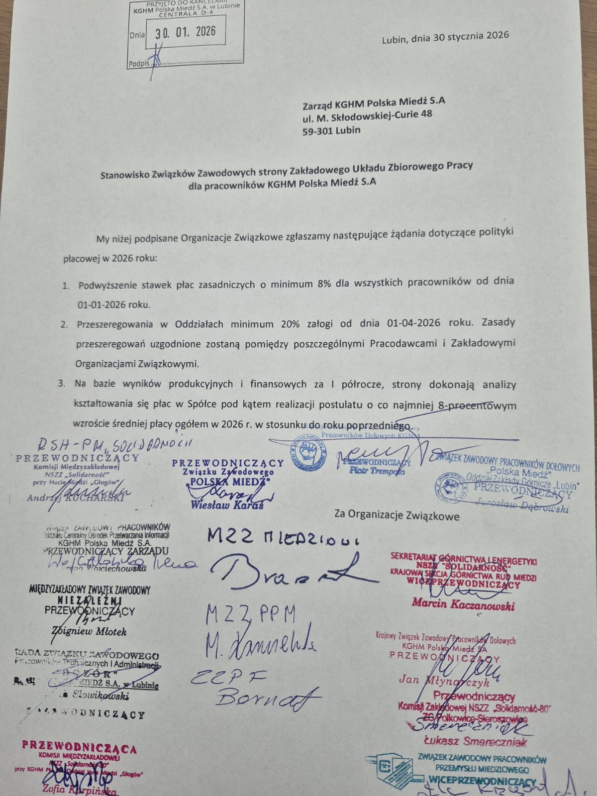 Związki zawodowe, będące stroną ZUZP, podkreślają, że ich stanowisko jest wspólne i wypracowane ponad podziałami organizacyjnymi. Wskazują również na odpowiedzialność i zaangażowanie pracowników jako podstawowe argumenty przemawiające za podjęciem konkretnych decyzji płacowych. Związkowcy liczą na szybkie rozpoczęcie merytorycznych negocjacji oraz przedstawienie przez Zarząd propozycji odpowiadających skali oczekiwań załogi. W ich ocenie decyzje płacowe powinny zostać podjęte bez zbędnej zwłoki, tak aby pracownicy odczuli realną poprawę swojej sytuacji finansowej już od początku roku.