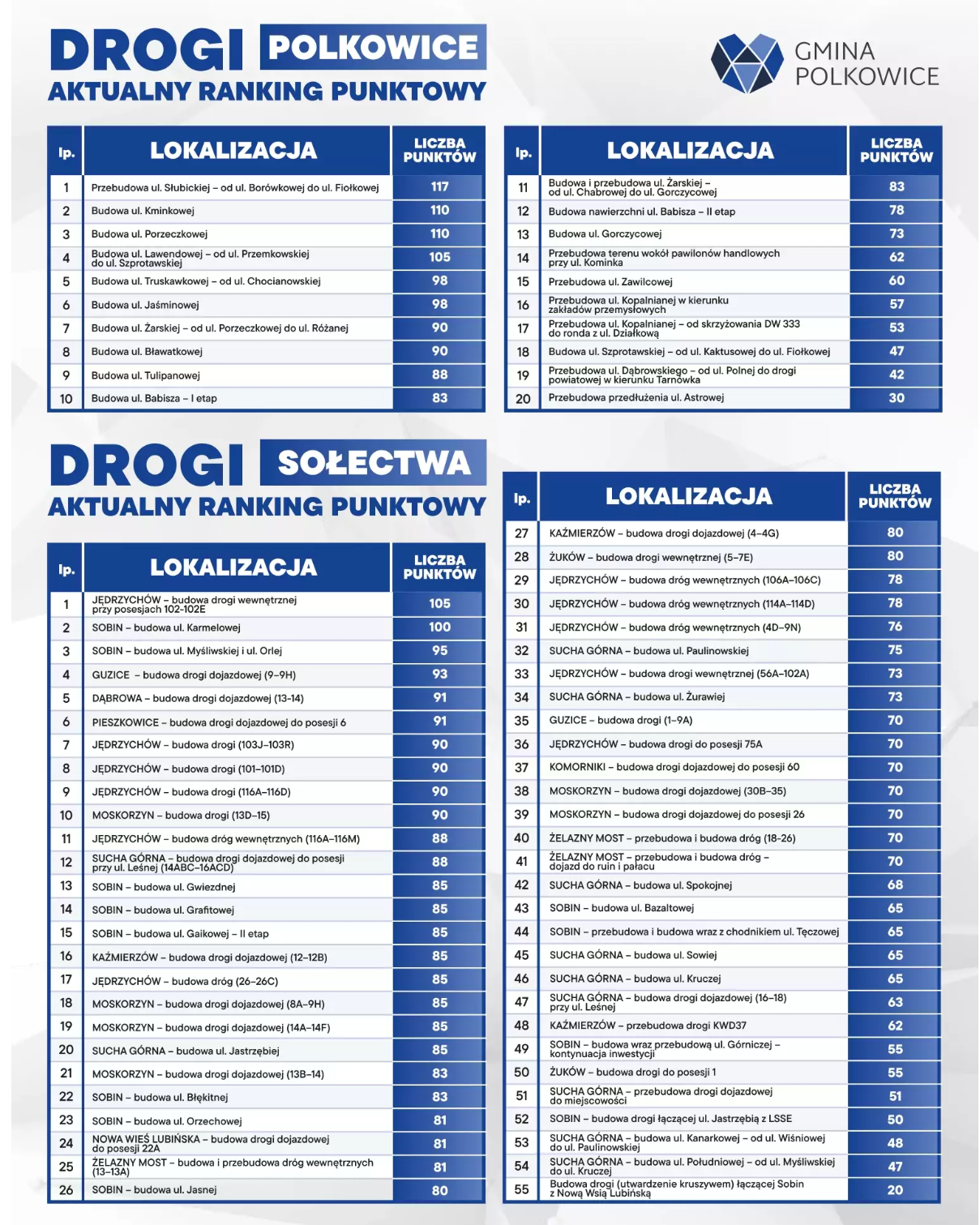 Podobne znaki zapytania pojawiają się w rankingu dla sołectw. Liderem jest Jędrzychów (budowa drogi przy posesjach 102-102E) z wynikiem 105 punktów. Choć potrzeby w sołectwach są ogromne, dysproporcje w punktacji między poszczególnymi miejscowościami budzą pytania o faworyzowanie konkretnych rejonów kosztem innych.